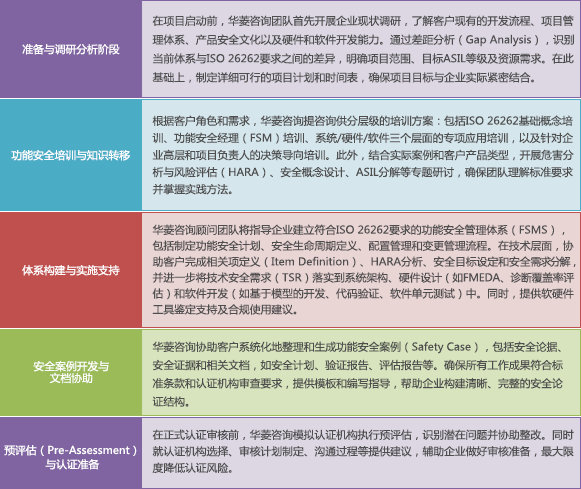 华菱咨询提供完整的ISO 26262认证咨询支持,服务流程主要包括:初步调研与分析、功能安全基础知识导入、标准条款培训、安全生命周期实施辅导、项目预评估及认证准备。公司依托资深行业背景的咨询团队,帮助企业建立符合标准要求且贴合实际的安全管理体系,协助客户顺利通过第三方认证,提升产品功能安全水平和市场竞争力。